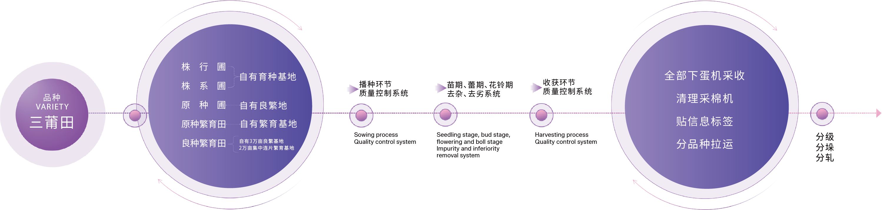 In the production process, a quality control system is established covering the entire process from sowing to harvesting. Roguing and elimination of inferior plants are conducted during the seedling, bud and boll stages to ensure varietal purity throughout the growth cycle. For harvesting, balers are adopted for cotton picking, and the process follows standardized steps: dedicated personnel clean the cotton pickers, each bale is labeled with detailed variety and production information, seeds of different varieties are transported separately, and ginning is carried out by grade, stack and variety. These measures ensure the orderly and standardized handling of seeds from the field to the processing workshop, thus guaranteeing the quality and purity of the harvested seeds. The improved seed multiplication system effectively safeguards seed quality, boosts agricultural production efficiency and drives the development of agricultural modernization.